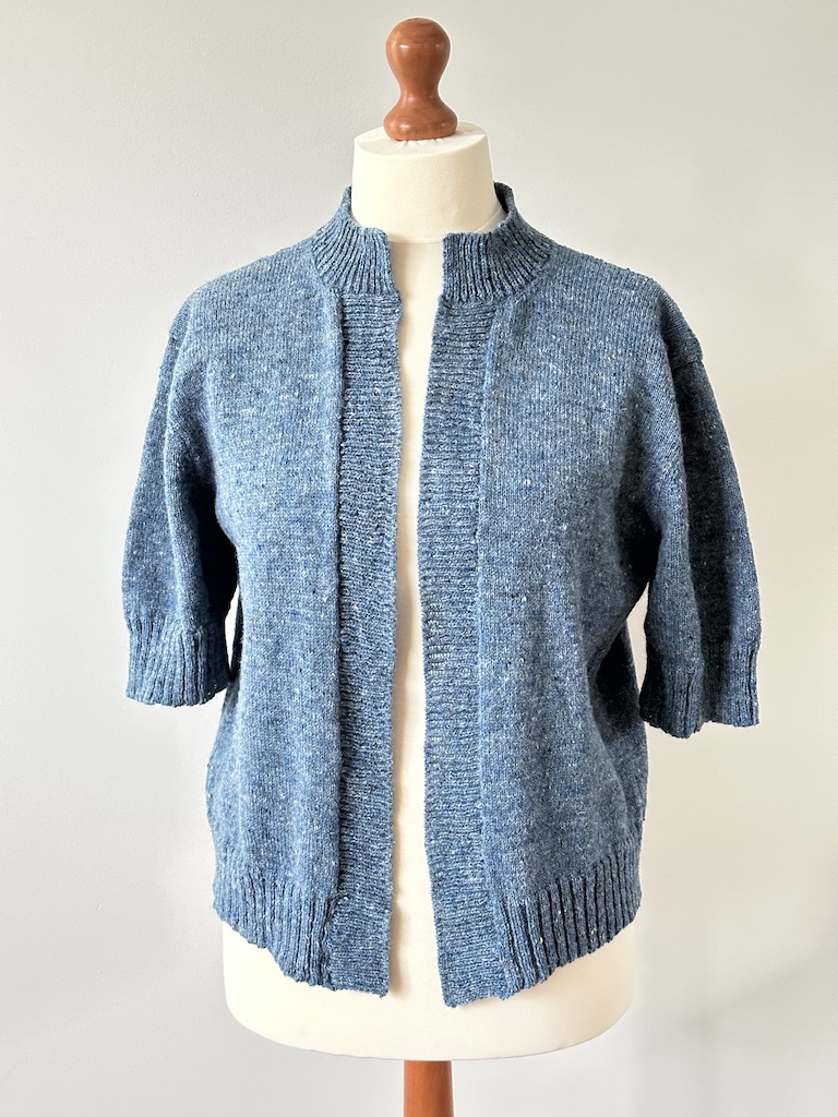 π¬π§ In spring and summer evenings, I often want to throw something on with short sleeves but have never found anything that really fits my needs. All the body warmers, slipovers, or vests are closed at the front and often have no sleeves at all. I wanted something like a sweater-jacket but with short sleeves. So, I finally used DAK (Design A Knit) to design a cardigan from scratch.
