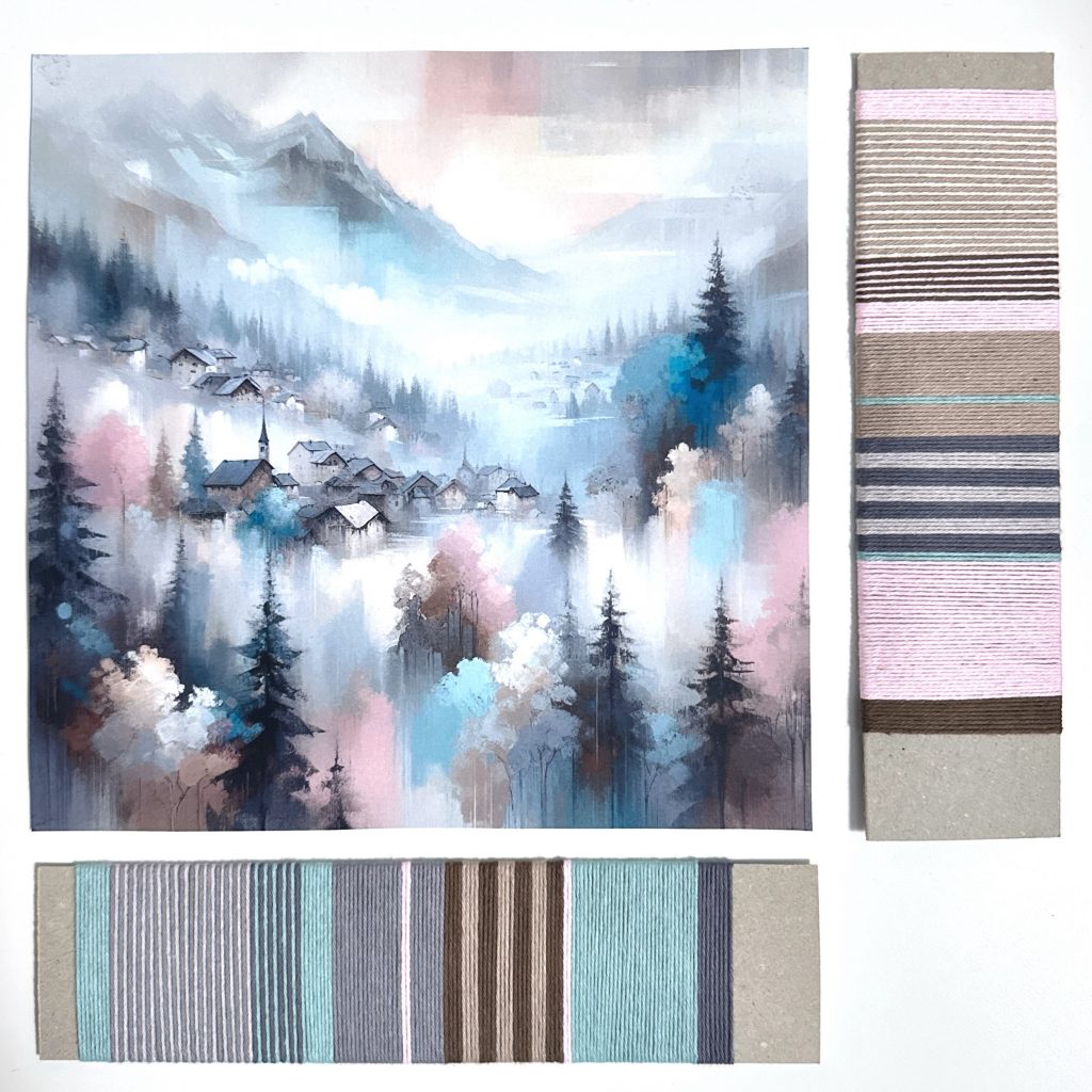 I joined the “Painting with wool” workshop planning to make another blanket from the cotton yarn that was left over from the 2023 blanket KAL. The intention was to use some inspiration from nature or a painting to make some nice yarn windings. The windings will then be used to determine the color setting for the blanket. At the end, I did not manage to knit anything. That does not matter too much. I enjoyed the yarn winding and playing with yarn and colors nevertheless. Note: The art shown is AI generated, the yarn winding is real.
