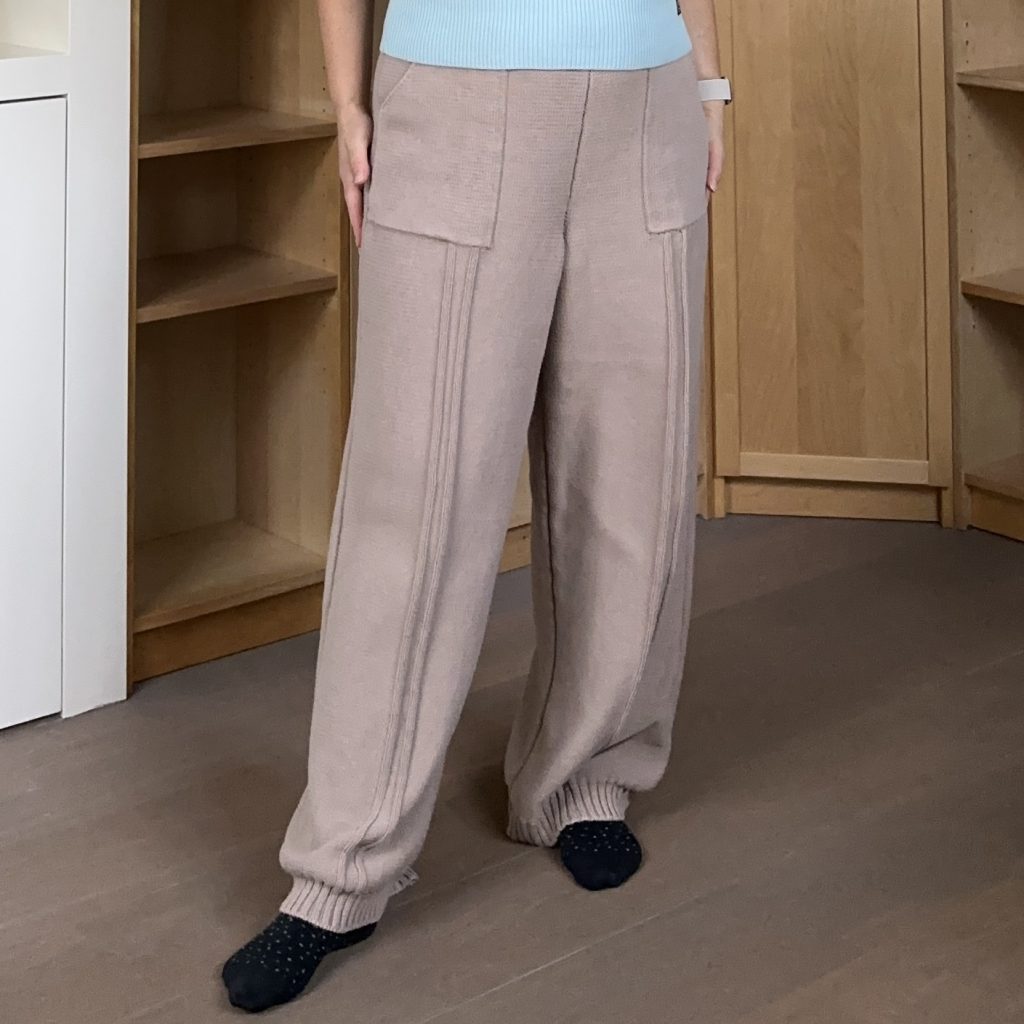 The biggest expericen of the year as joining the masterclass of Hannelie Bekker (Wrapt Knitwear) to make my very first knitted pants. Everyone is knitting scarfs, shawls, jumper, and cardigans. But pants are not really often on the needles. I was curious to try that out; especially since knitted loungewear was on the rising. The class included two different styles of pants, one with wide (STRIDE) and one with very narrow (TRACK) legs. I decided to go for the wide leg STRIDE pants because I really liked the shown example pants. I also loved some stripe details on the front legs.